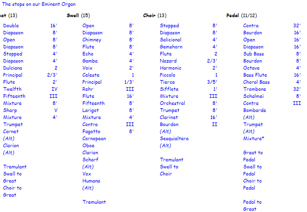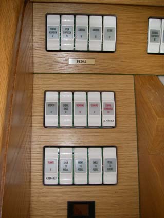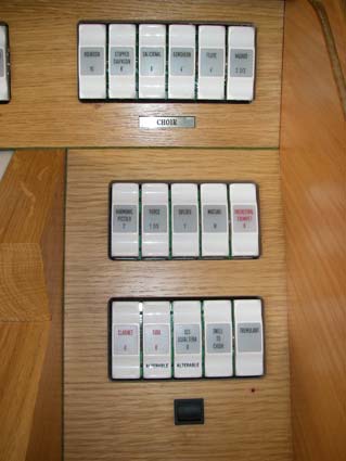 Each manual has eight thumb pistons, the Pedal has four toe pistons, and there are eight general thumb and toe pistons that control the entire organ. There is also a continental setting piston that was never set up - I could not get the company back to do the voicing that I had paid for. When you purchase the organ, any of the stops from the library can be put onto the organ, and the others can be loaded into the adjustable stops. We used the set that were recommended, but my friend Simon had a different set on his Eminent, so he has 2 different sounding open diapasons on his Great and a stopped diapason as well. His swell and great tabs are in an inverted position. One of the nice things about the 3 manual Eminent organ is that we could choose all the stops. In addition to these stops there are others which can be selected. We went for the selection in the brochure since we did not know enough about organs then. The company we bought the organ from Cathedral organs and our organ tutor suggested a good range of stops (above) which seem to be a good choice. I also bought some special voicing software to go with the Eminent organ so that we can change the sounds of any of the stops. At £500 it was not cheap.