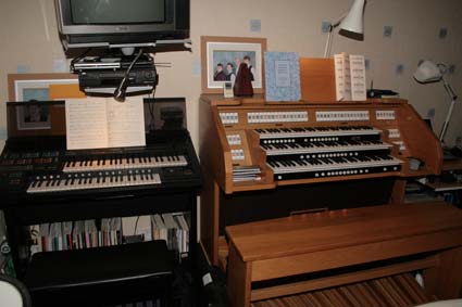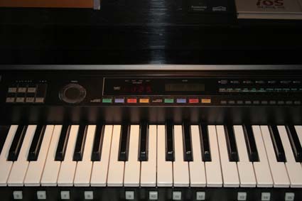 The 2 manual Yamaha HS8 organ. The HS8 Organ is dwarfed by the Eminent organ next to it. The Yamaha HS8 like many other home organs has two four octave manuals set one octave apart. I started with an HS4 back in 1988 and played this for a few years, then later upgraded to a second hand HS8. It is a fun organ to play with a sampled pipeorgan, and Piano and a few other instruments. All the others are generated and although at the time the instruments were good, the sounds are not as good as the new sampled organs. All the voices can be set onto each manual. There is an additional solo (lead) voice that can be played on either the top or the bottom manual. The HS8 has 16 general registers that can recall a particular voice setting. There is a small 1 1/2 octave range for the pedals. These are the common short spinnet -variety and are not polyphonic. The simple LED info screen gives the speed of the accompaniment section and an lcd screen gives a menu listing.